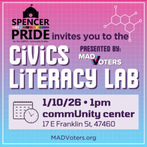 You are invited to a CIVICS LITERACY LAB on Saturday, January 10 at 1 pm at the Spencer Pride commUnity center. Join us for a free, in-person, interactive workshop designed to provide Hoosiers with important, nonpartisan information about the civic process so that they can better advocate for themselves and their communities.
